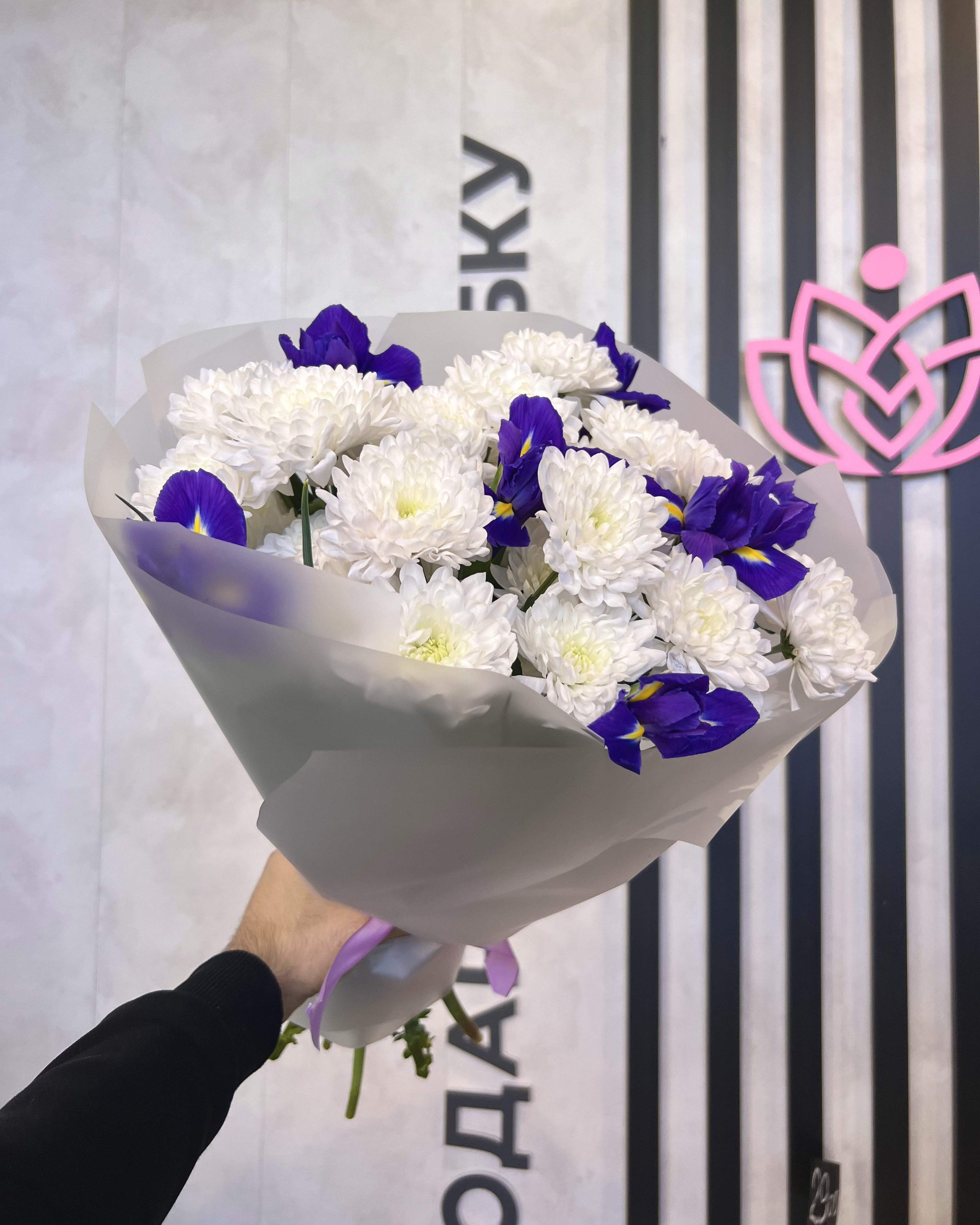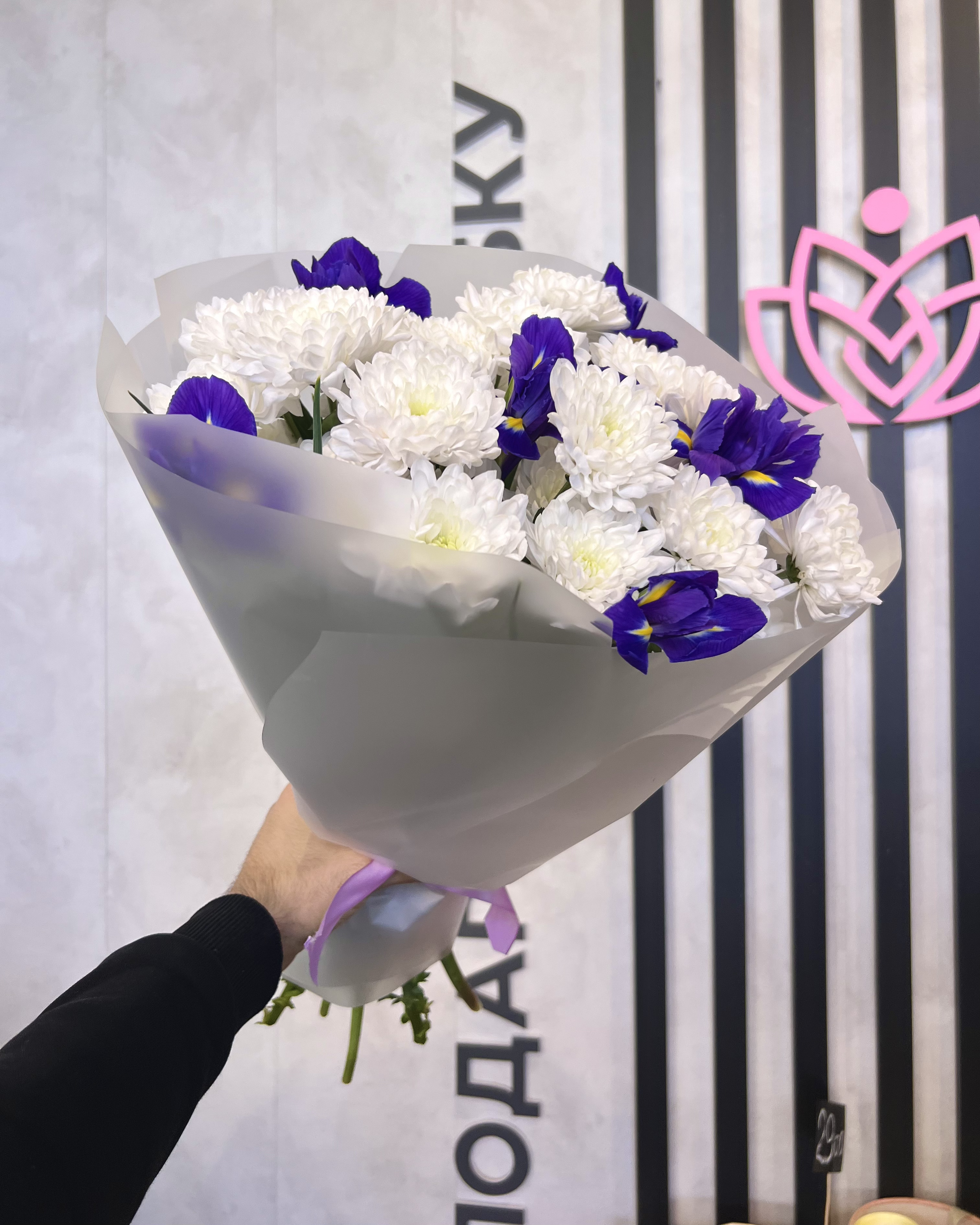 Ирис - 7 шт. Хризантема кустовая - 4 шт. Атласная лента - 1 шт. Матовая упаковка - 1 шт.
