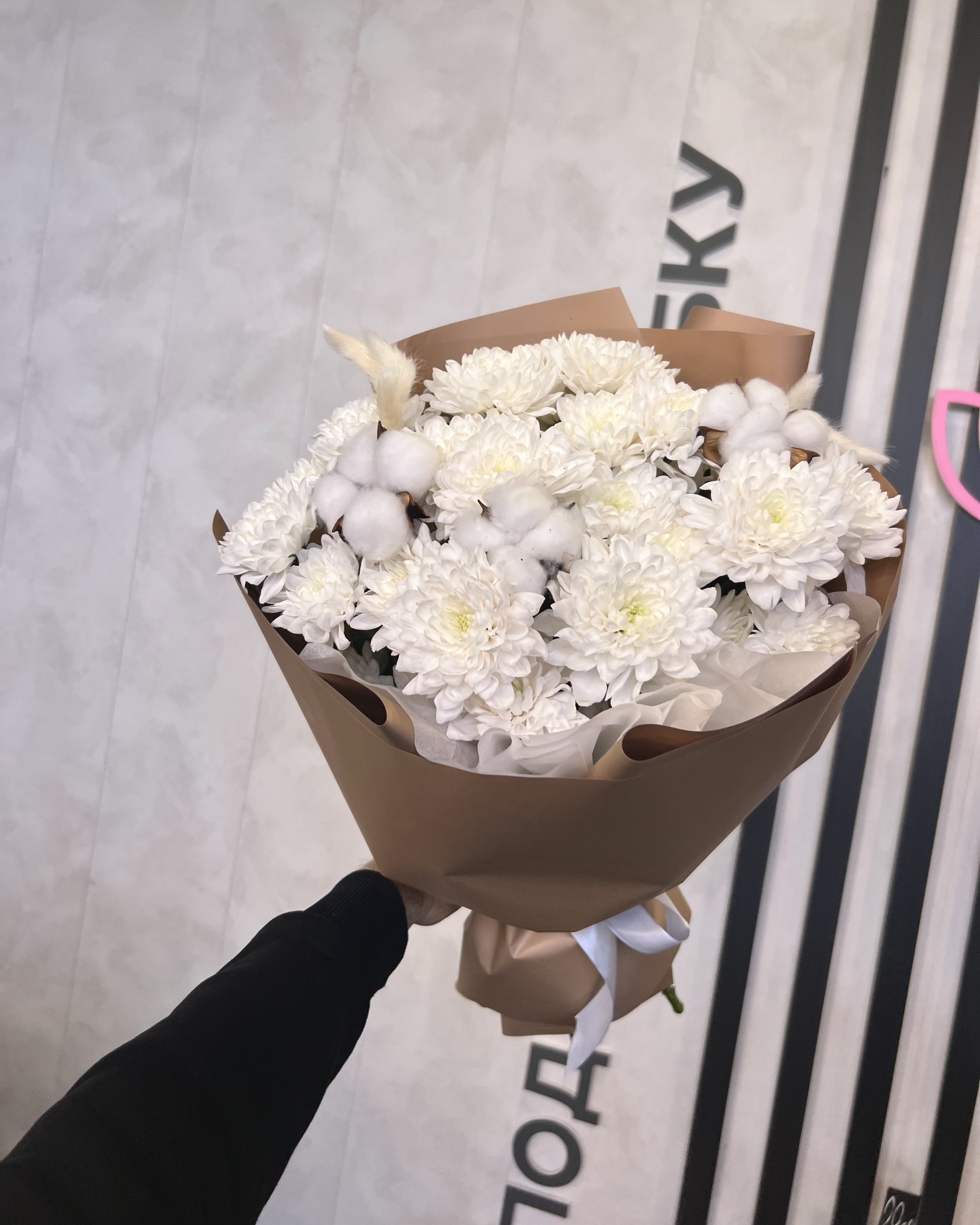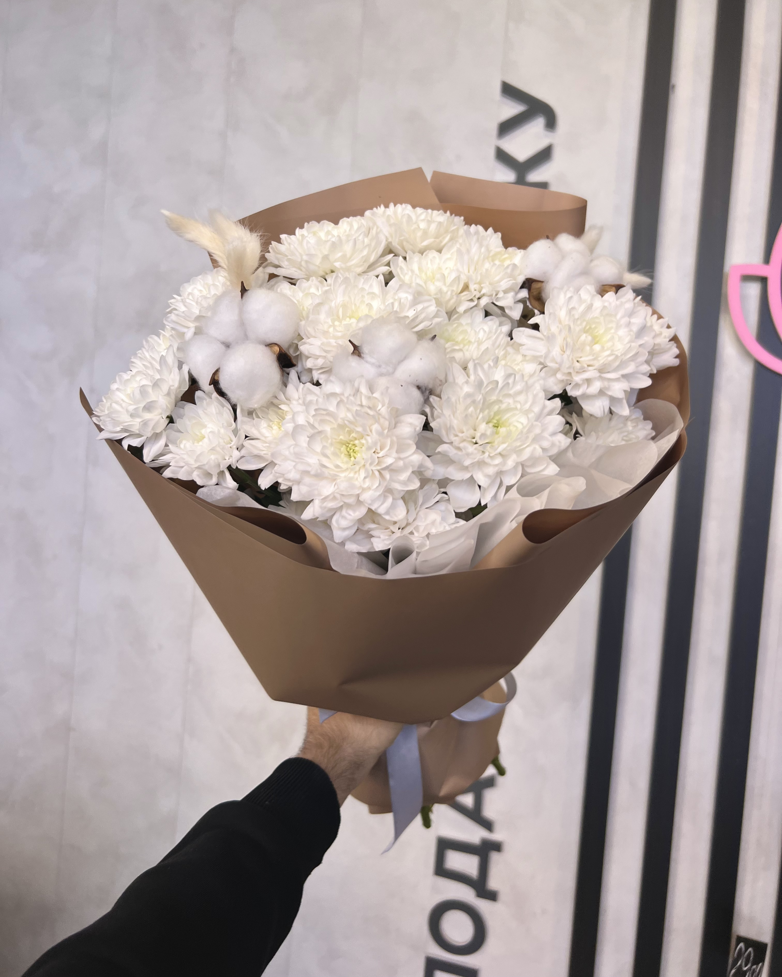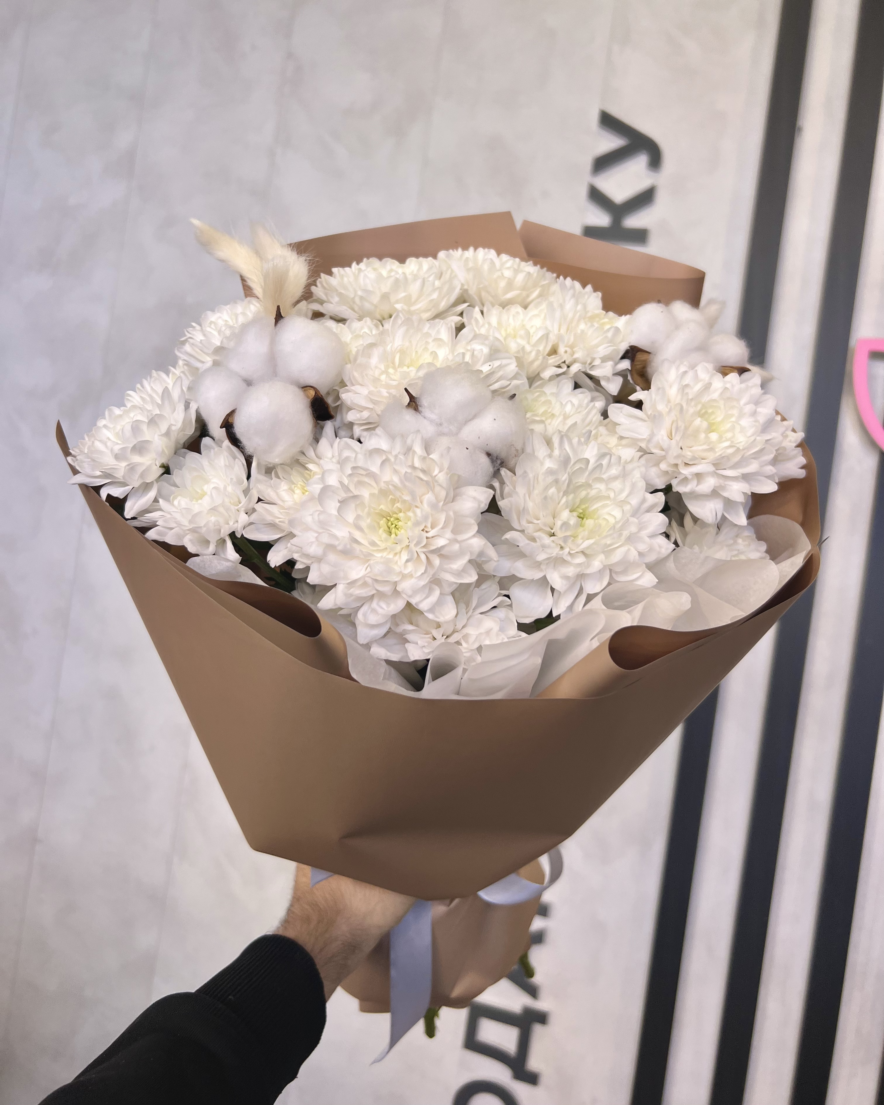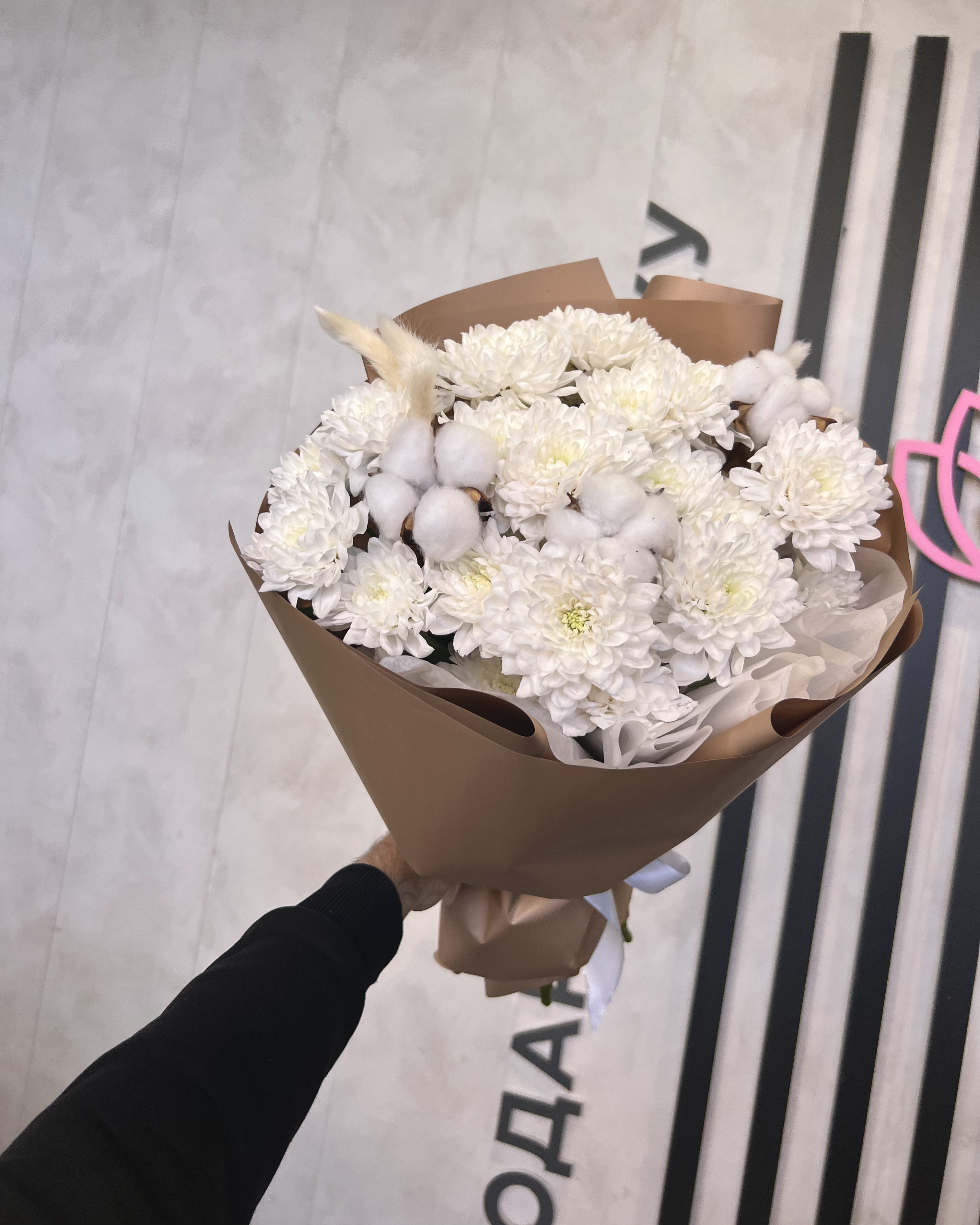 Букет из белой хризантемы, натурального хлопка, лагуруса создает атмосферу нежности и утонченности. Идеально подходит для выражения искренних чувств и комплиментов! Ваш уникальный подарок подчеркнет индивидуальность получателя и станет источником радости.